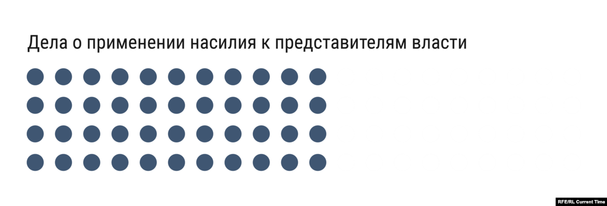 Большая часть дел связана с применением насилия к представителям власти – их по всей России заведено 44. На некоторых участников акций завели уголовные дела, несмотря на их заявления о том, что они, наоборот, пытались защититься от полицейских. Пятерым фигурантам по этим делам уже вынесли обвинительные приговоры: житель Владимира получил 3 года колонии, житель Москвы – 2 года колонии, другой житель Москвы получил 1,5 года условно, житель Костромы был приговорен к 1,5 годам принудительных работ, житель Нижнего Новгорода получил штраф.